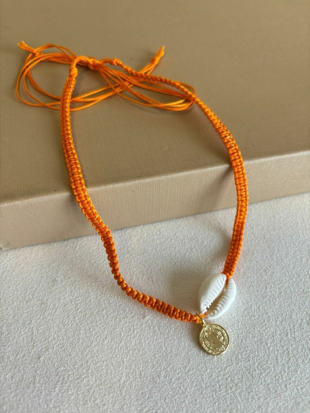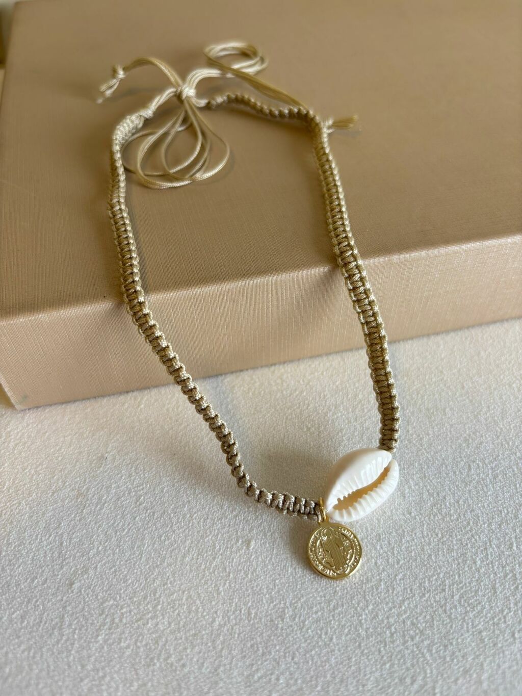 Design Exclusivo e Versátil Confeccionado em macramê, o colar traz um acabamento artesanal que combina perfeitamente com estilos casuais ou mais sofisticados, proporcionando um look único para o dia a dia ou ocasiões especiais. O búzio, símbolo de proteção e conexão com a natureza, junto à medalha, conferem significado e elegância ao acessório.